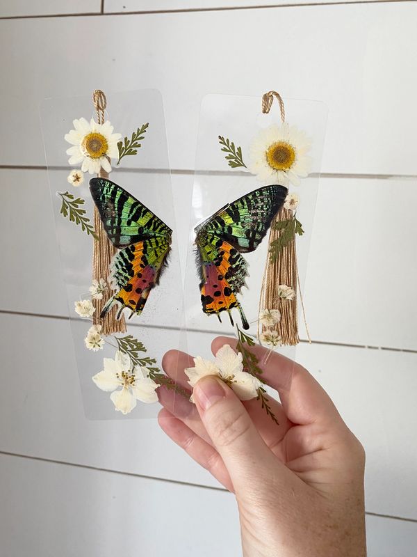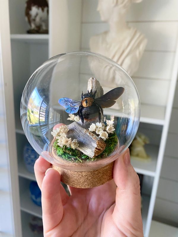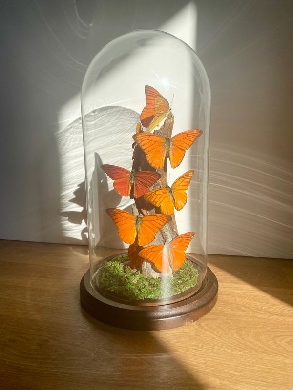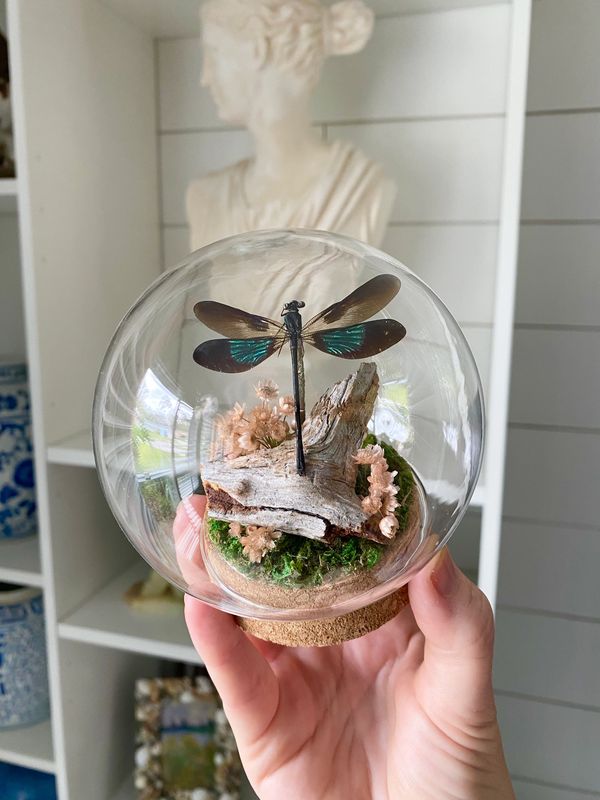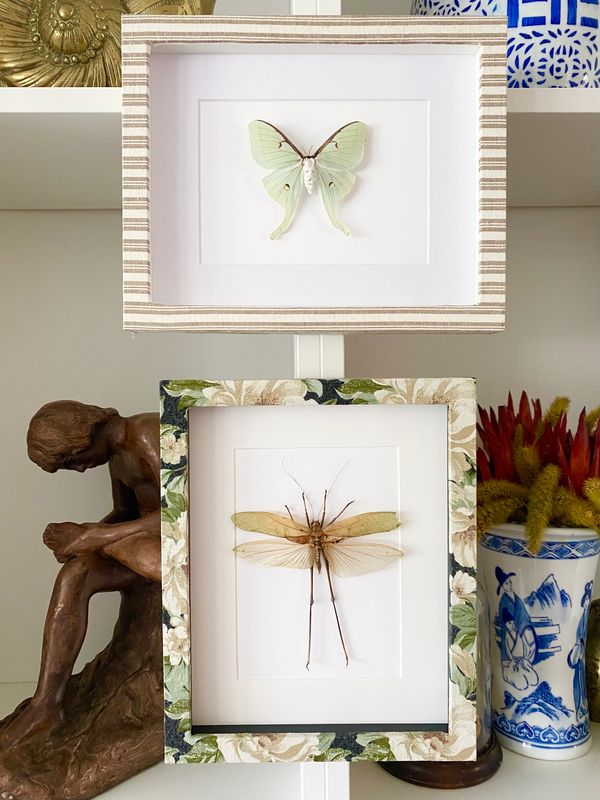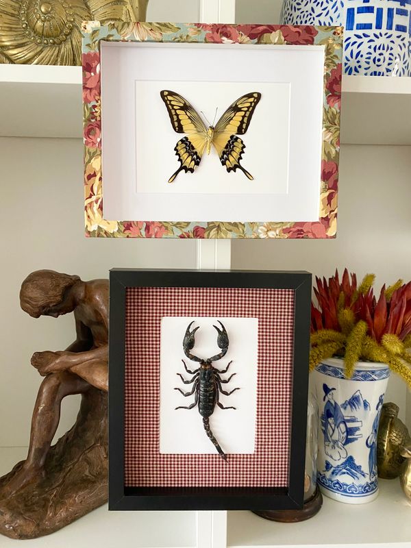 Every butterfly, moth, or insect I work with is ethically sourced from insect farms from around the world, then carefully rehydrated, pinned, and mounted by hand. I love pairing each specimen with vibrant fabrics, delicate flowers, or glass domes that highlight their unique colors and details — creating a modern cabinet of curiosities that feels magical.