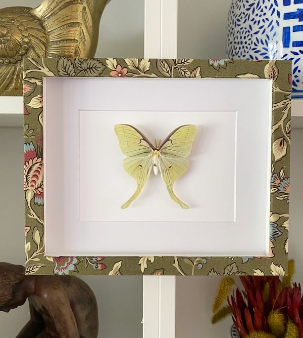 Every butterfly, moth, or insect I work with is ethically sourced from insect farms from around the world, then carefully rehydrated, pinned, and mounted by hand. I love pairing each specimen with vibrant fabrics, delicate flowers, or glass domes that highlight their unique colors and details — creating a modern cabinet of curiosities that feels magical.